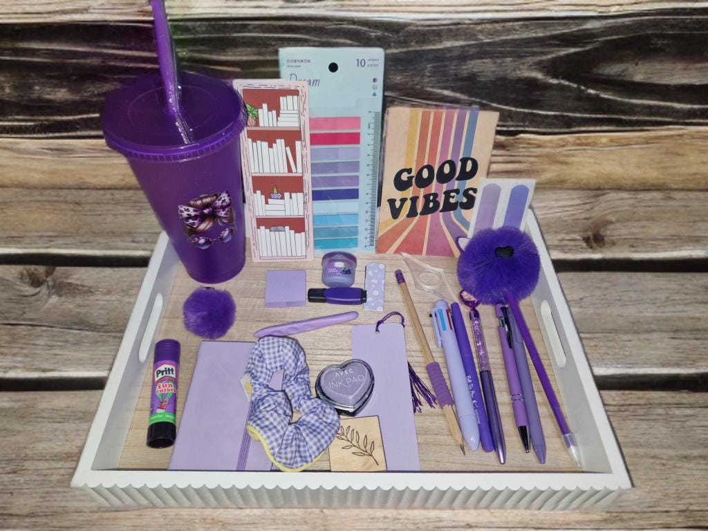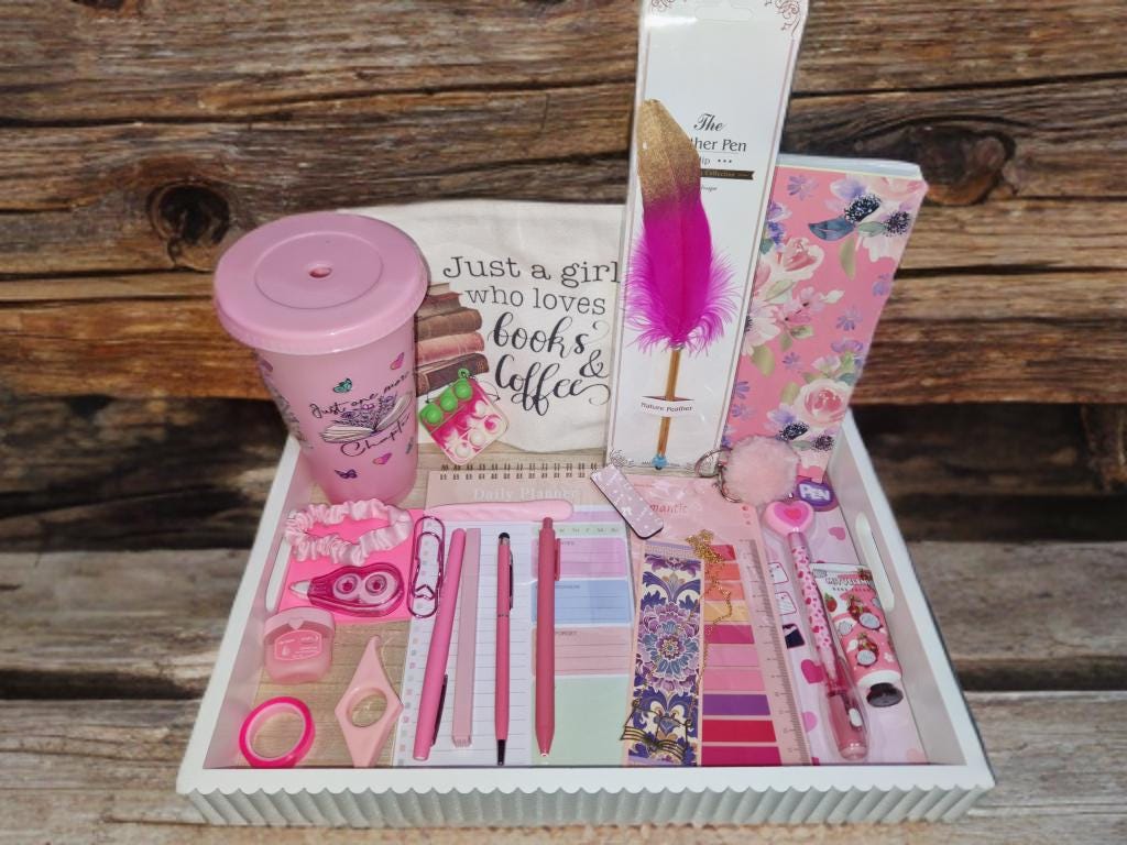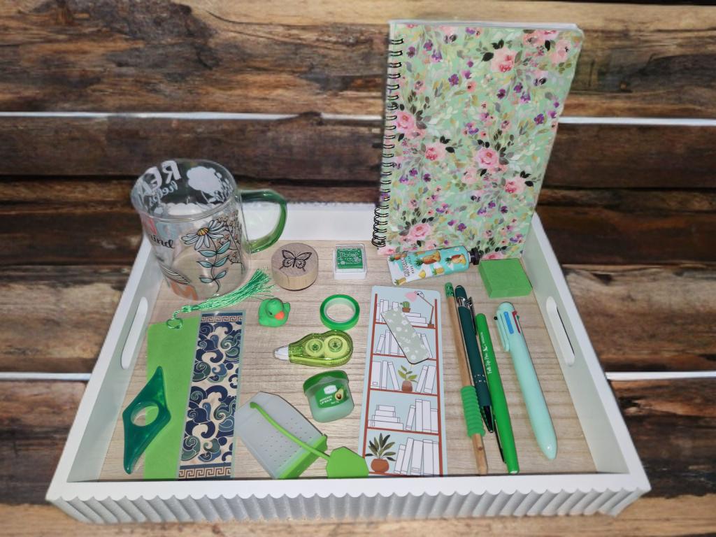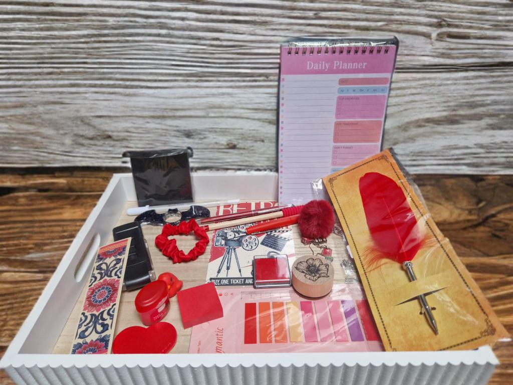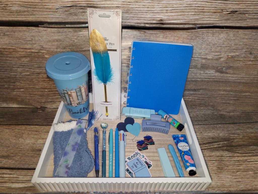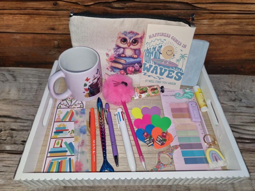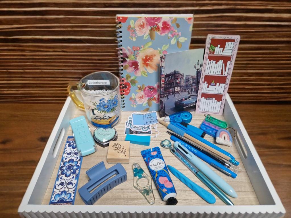 Lesezeichen, Notizbücher, Stifte, Kugelschreiber, Textmarker, Schlüsselanhänger, Aufkleber, Post-it`s (verschiedene Größen und Designs), Scrunchies, Haarklammer, Handcreme, Lippenbalsam, Stempel, Stempelkissen, Seitenhalter, DIY-Lesezeichen, Radiergummi, Textmarker-Tape, Fidget´s, Postkarten, Korrekturroller, Entscheidungsmünze, Klebestift, Bleistifte, Lederherz (Seitenmakierer), Büroklammer mir Stifthalterung, Washi-Tape uvm.